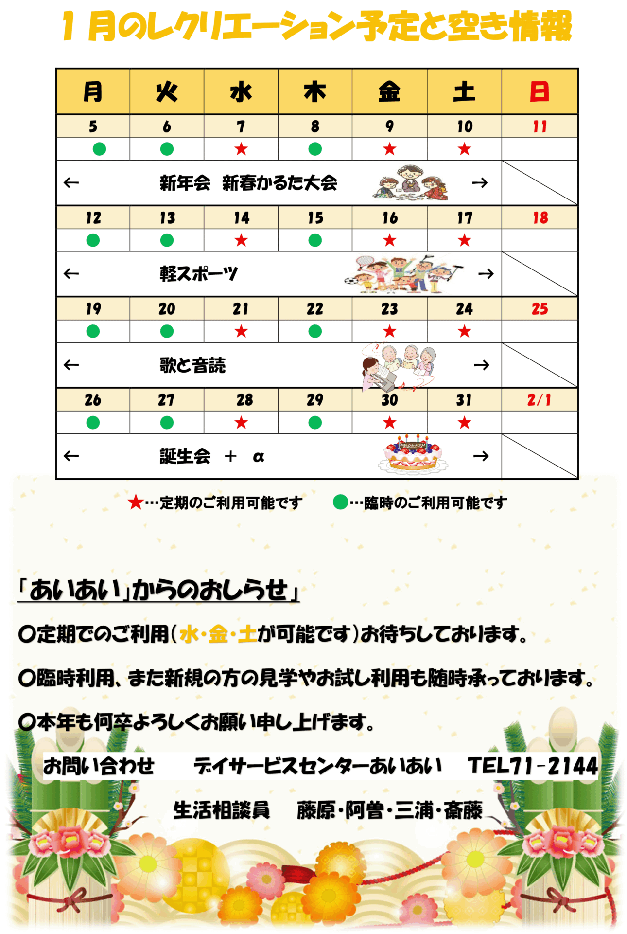 1月のレクリエ―ション予定と空き情報